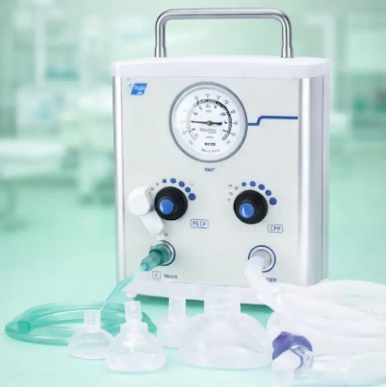 Peralatan bantuan pernapasan untuk bayi dan neonatus yang dirancang untuk memberikan dukungan respirasi secara aman dan efektif. Produk ini membantu tenaga medis dalam menangani kondisi gangguan pernapasan pada bayi baru lahir.
